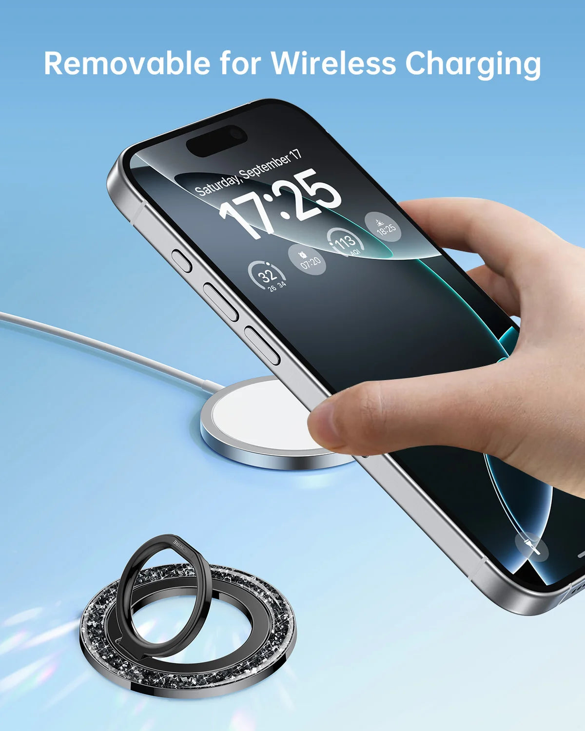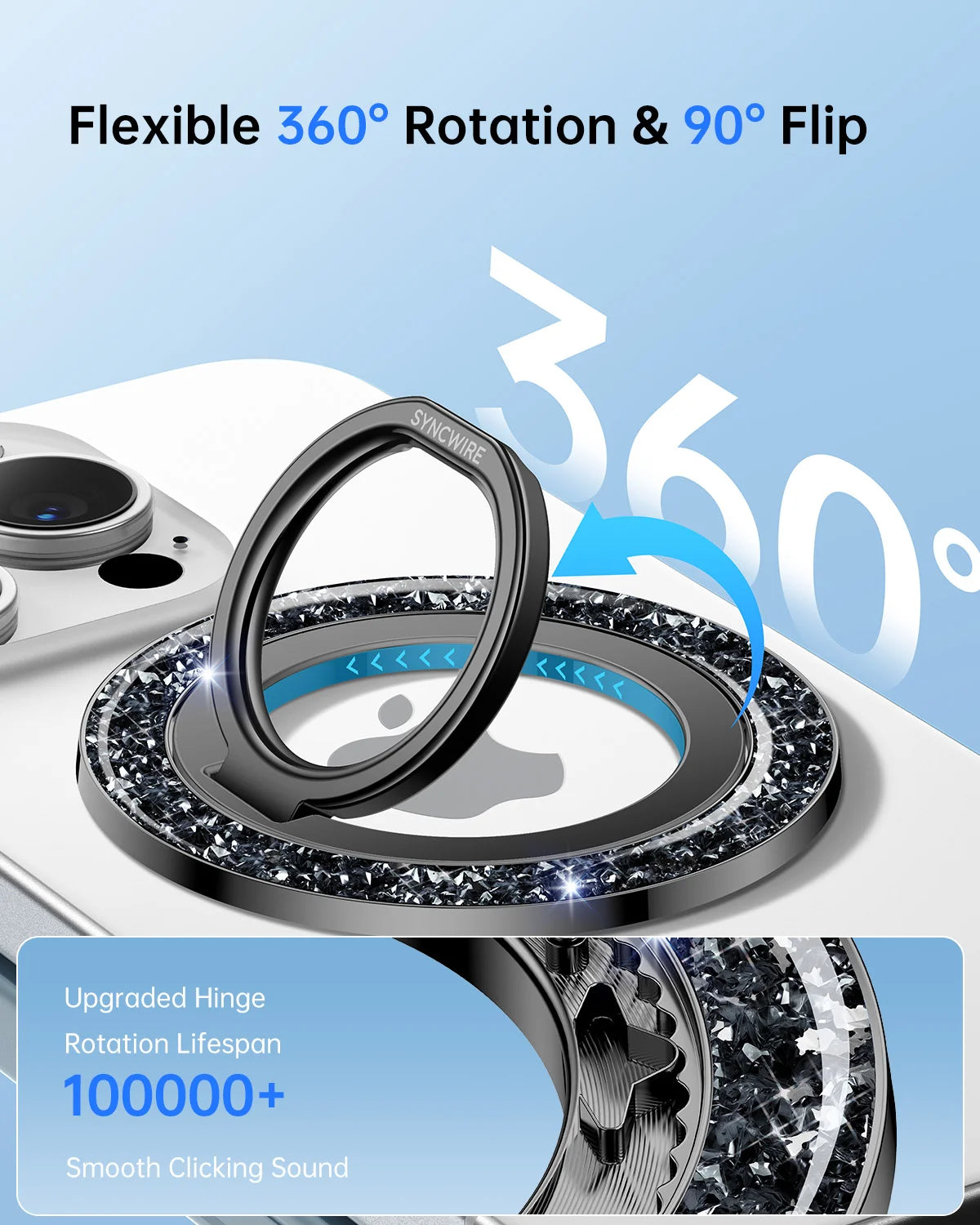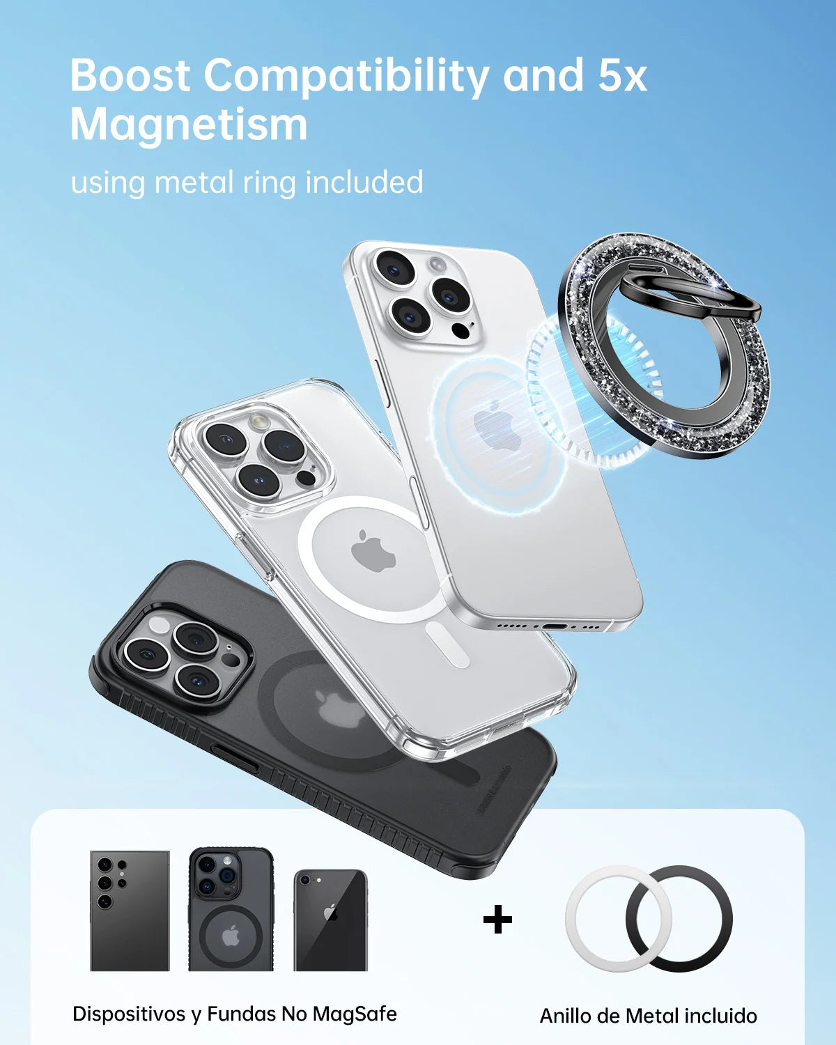 - Magnético súper fuerte: El soporte magnético para teléfono con aro Syncwire Glitter está fabricado con imanes N55 de NdFeB, que proporcionan una fuerza magnética excepcional. Puedes sujetar tu teléfono al soporte magnético MagSafe con un solo dedo, disfrutando de una sujeción firme que resiste vibraciones y movimientos. La fuerza magnética se multiplica por 5 al usarlo con el anillo metálico incluido.